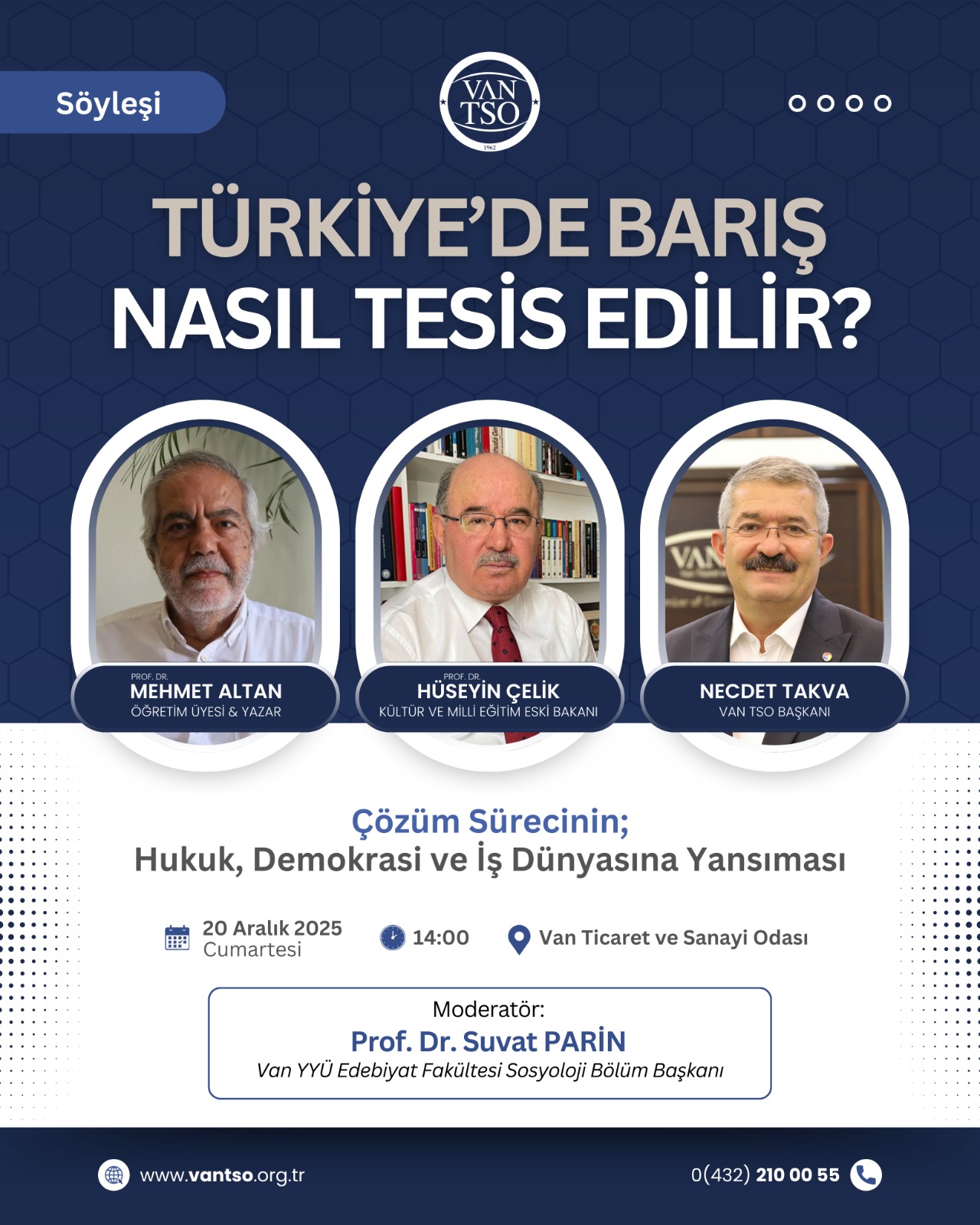 “Çözüm Sürecinin; Hukuk, Demokrasi ve İş Dünyasına Yansıması”nın ele alınacağı söyleşiye önemli isimler konuşmacı olarak katılacak. Moderatörlüğünü Van Yüzüncü Yıl Üniversitesi (Van YYÜ) Edebiyat Fakültesi Sosyoloji Bölümü Başkanı Suvat Parin’in yapacağı “Türkiye’de Barış Nasıl Tesis Edilir?” söyleşisinde; Kültür ve Milli Eğitim eski bakanlarından Hüseyin Çelik, Öğretim Üyesi & Yazar Mehmet Altan ve Van TSO Yönetim Kurulu Başkanı Necdet Takva konuşmacı olarak yer alacak.